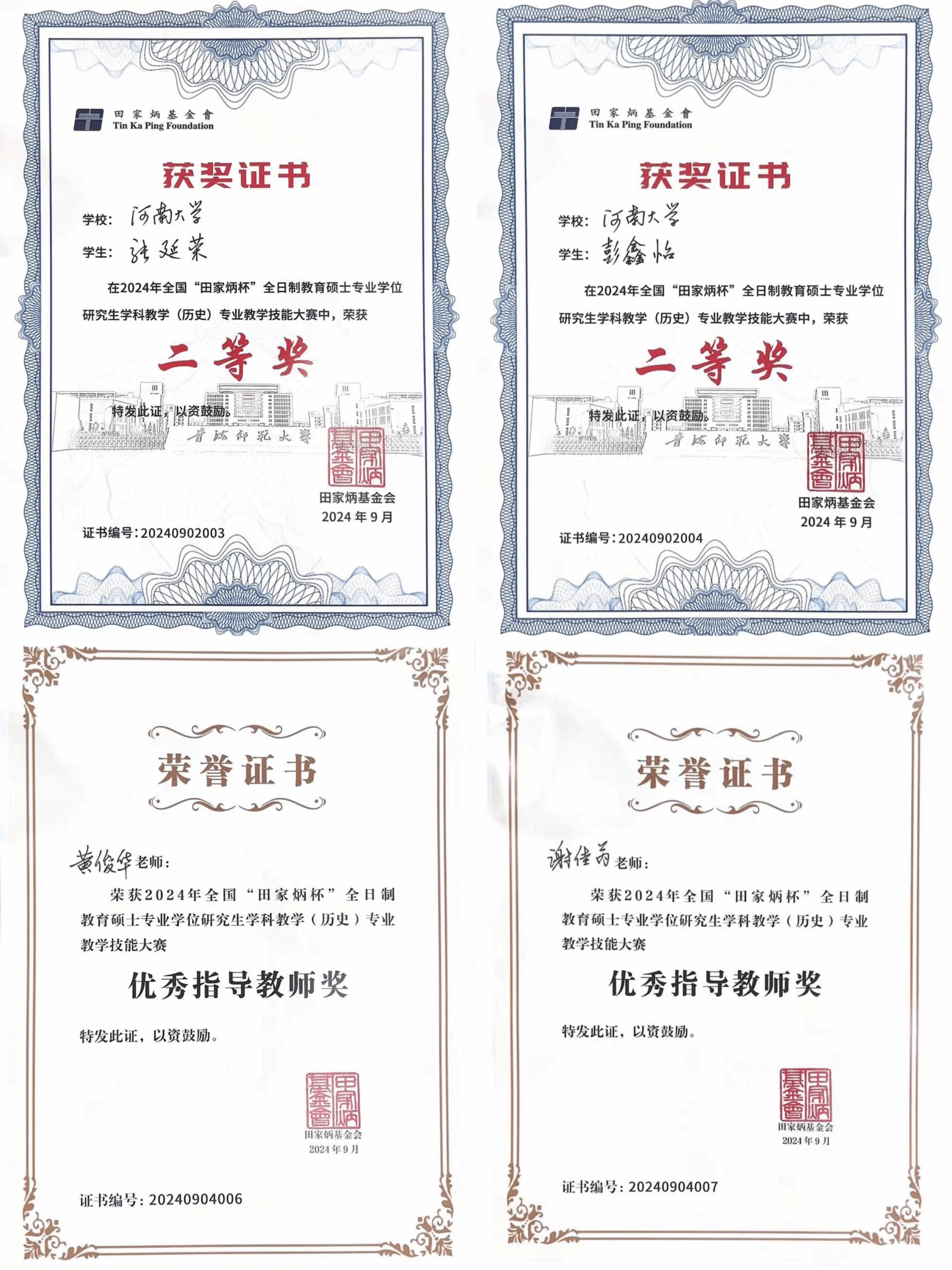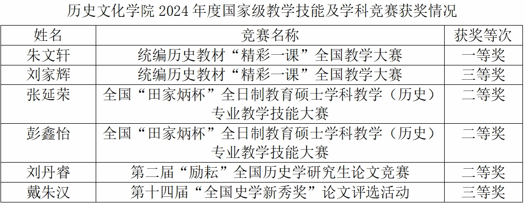 近日,2024年全国“田家炳杯”全日制教育硕士专业学位研究生学科教学(历史)专业教学技能大赛决赛在青海师范大学落下帷幕。bwin官网副经理闵祥鹏带队参赛,最终2023级学科教学(历史)专业员工张延荣、彭鑫怡分别斩获二等奖,指导教师黄俊华、谢佳芮荣获“优秀指导教师”称号。